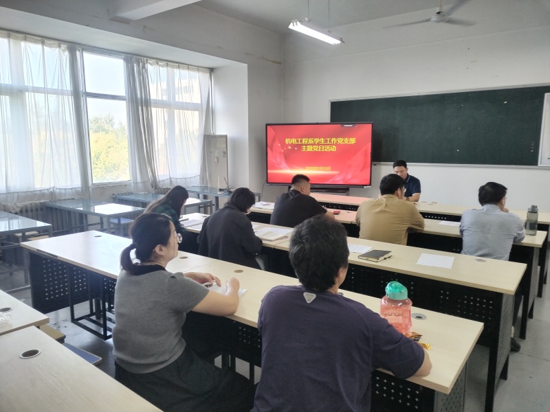 9月25日下午,机电工程系学生工作党支部在山润楼三楼335室开展九月份主题党日活动,活动由党支部书记张西进主持,机电工程系党总支副书记成元学及全体支部党员参加。